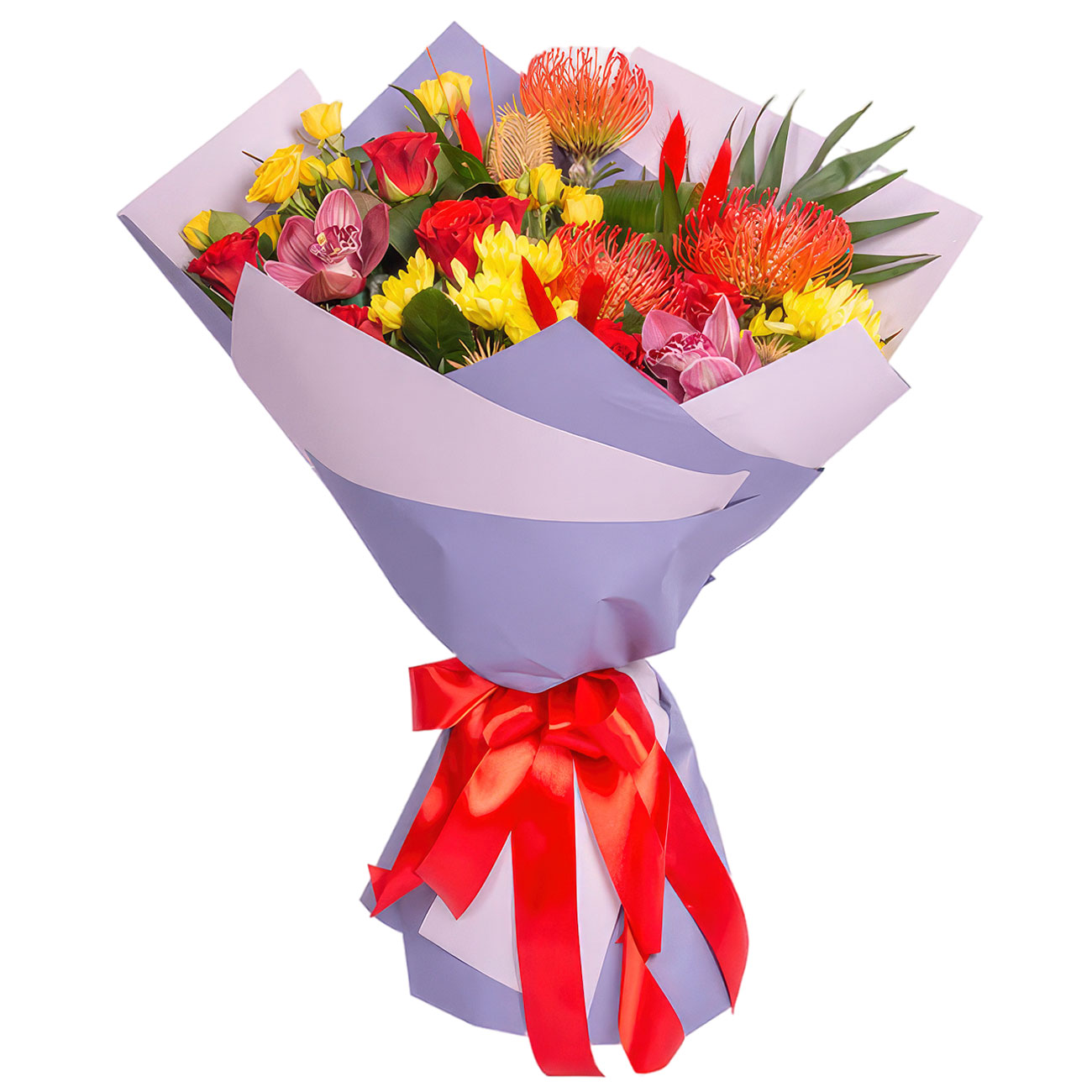 Роза кустовая желтая и красная, хризантема кустовая желтая, лейкоспермум, орхидея розовая, роза «Эль Торо», аспидистра, чико. Упаковка (лента, пленка, крафт, сетка, пленка матовая)