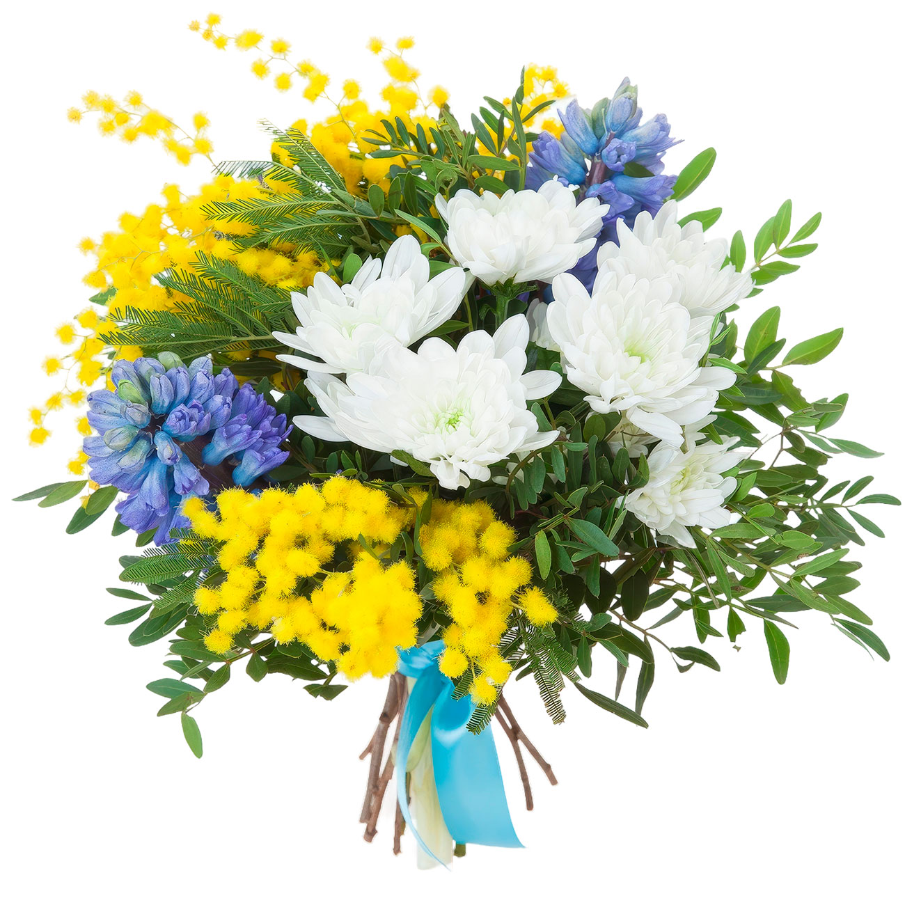Мимоза, гиацинт синий, хризантема одноголовая белая, зелень, фистация. Упаковка (лента, пленка, крафт, сетка, пленка матовая)