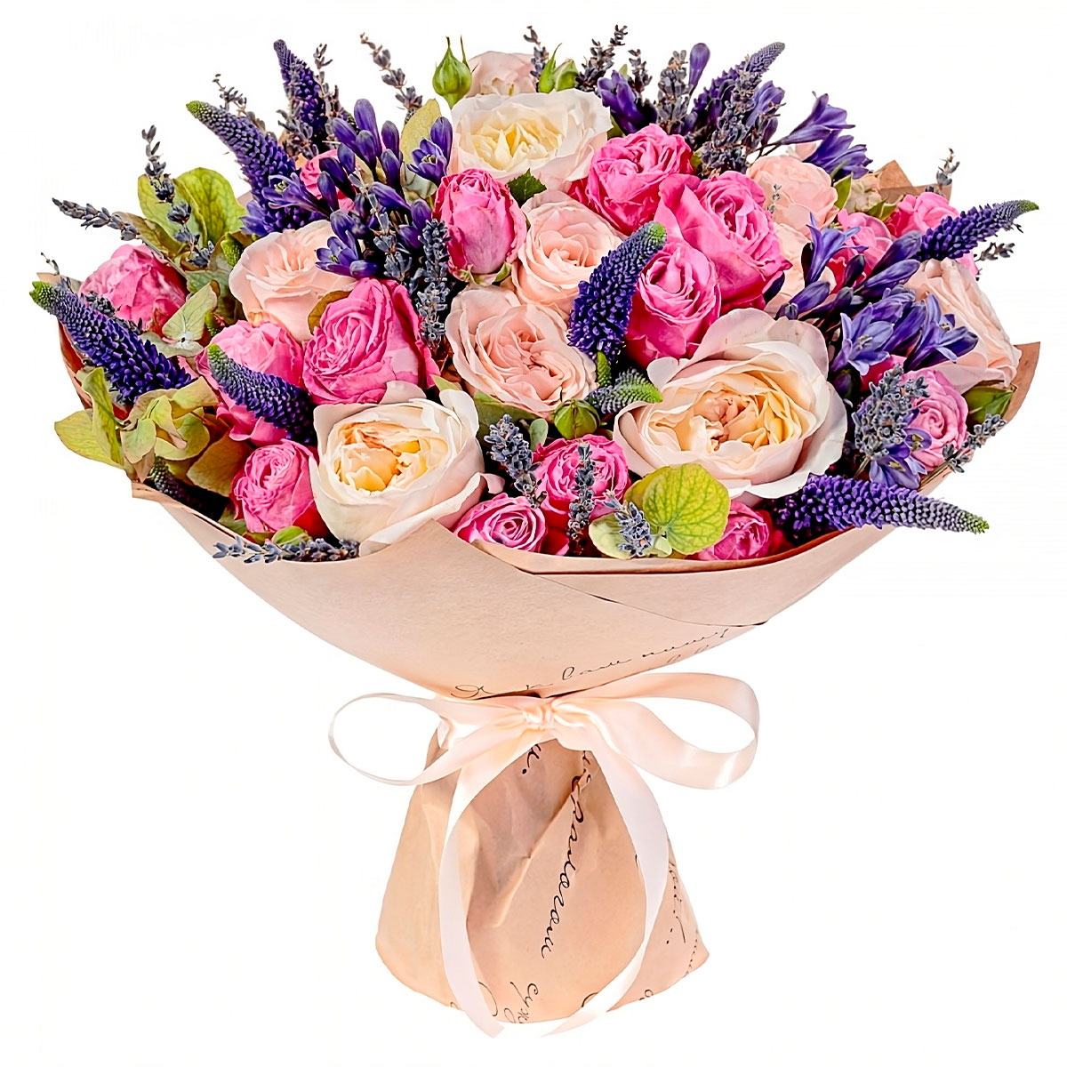 Роза кустовая розовая, роза пионовидная кремовая, вероника, лаванда. Упаковка (лента, пленка, крафт, сетка, пленка матовая)