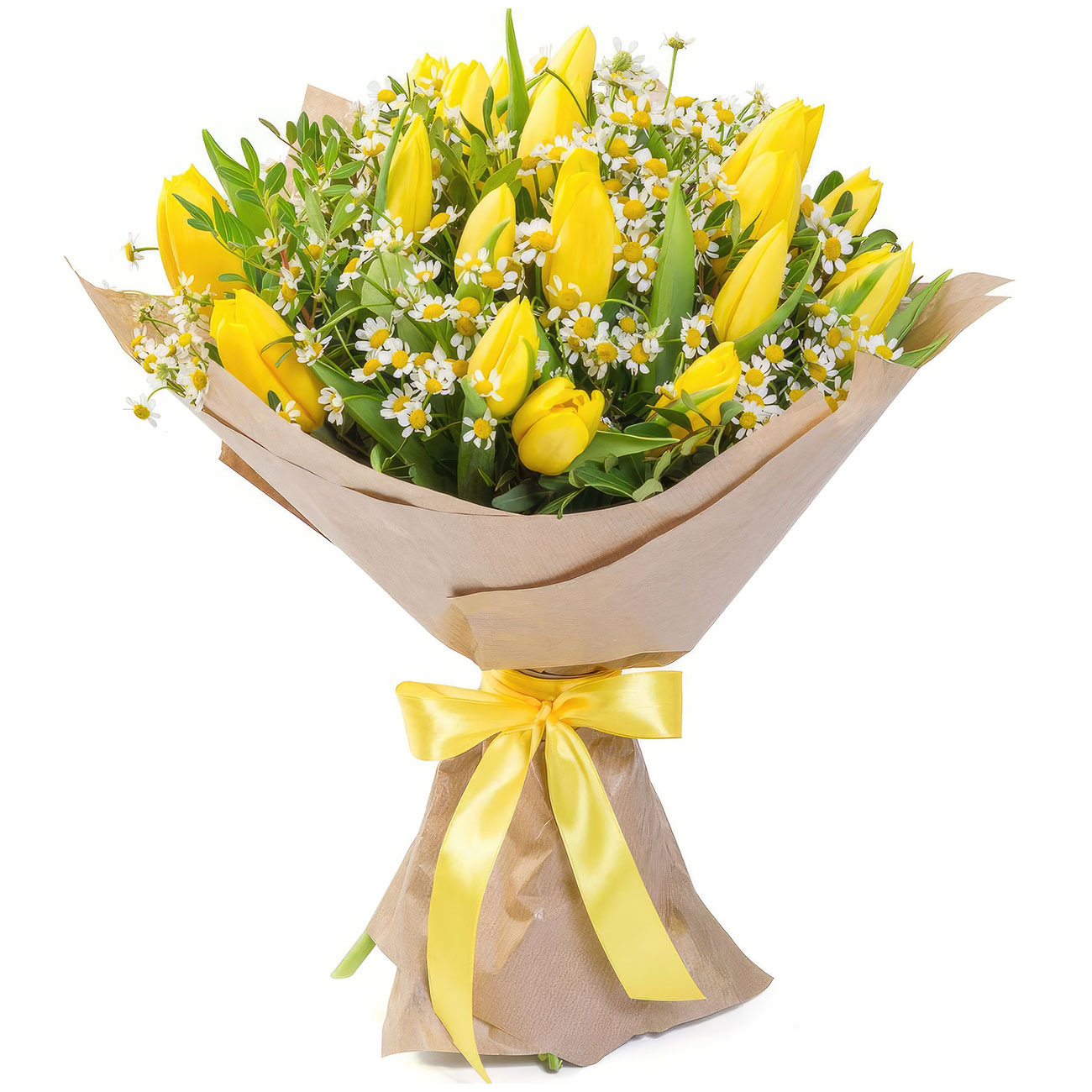 Тюльпан желтый, ромашка, фистация. Упаковка (лента, пленка, крафт, сетка, пленка матовая)