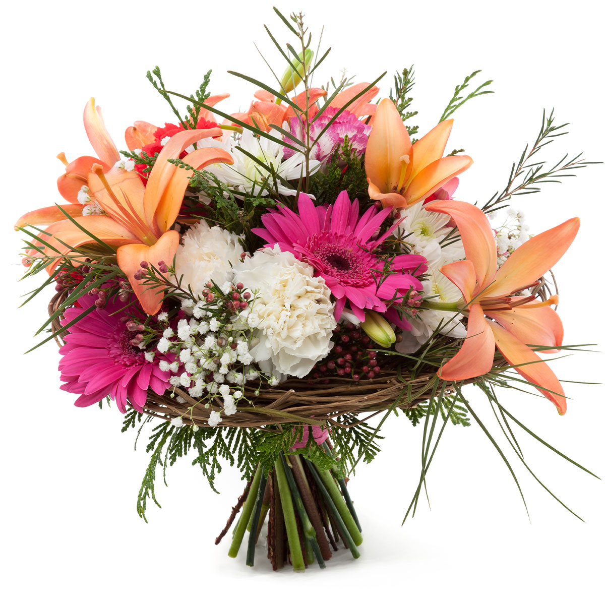 Лилия персиковая, гербера розовая, гвоздика белая, хризантема кустовая белая, озотамнус, туя, гипсофила. Упаковка (лента, пленка, крафт, сетка, пленка матовая)