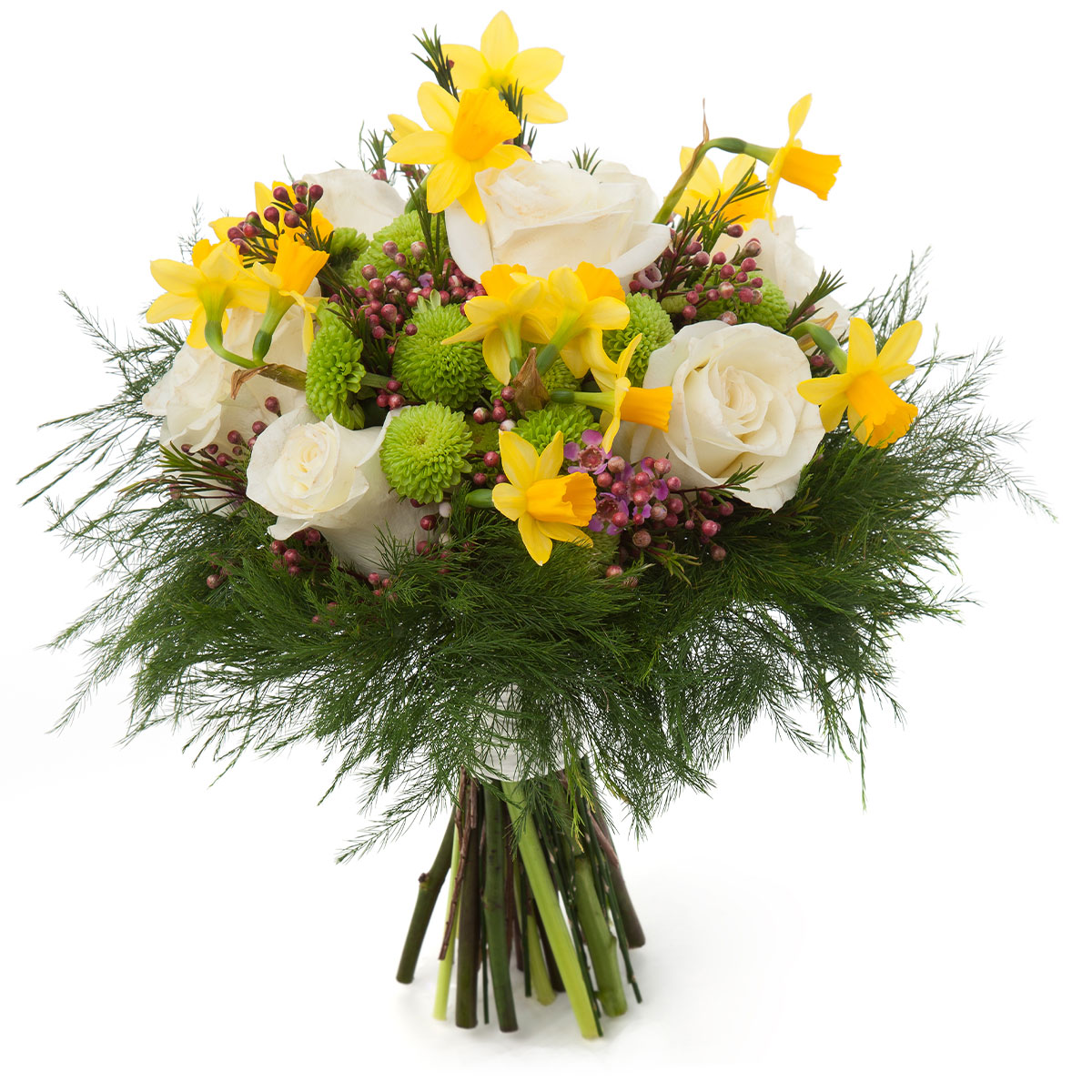 Роза одноголовая белая, нарцисс желтый, хризантема кустовая зеленая, ваксфлауэр, аспарагус. Упаковка (лента, пленка, крафт, сетка, пленка матовая)