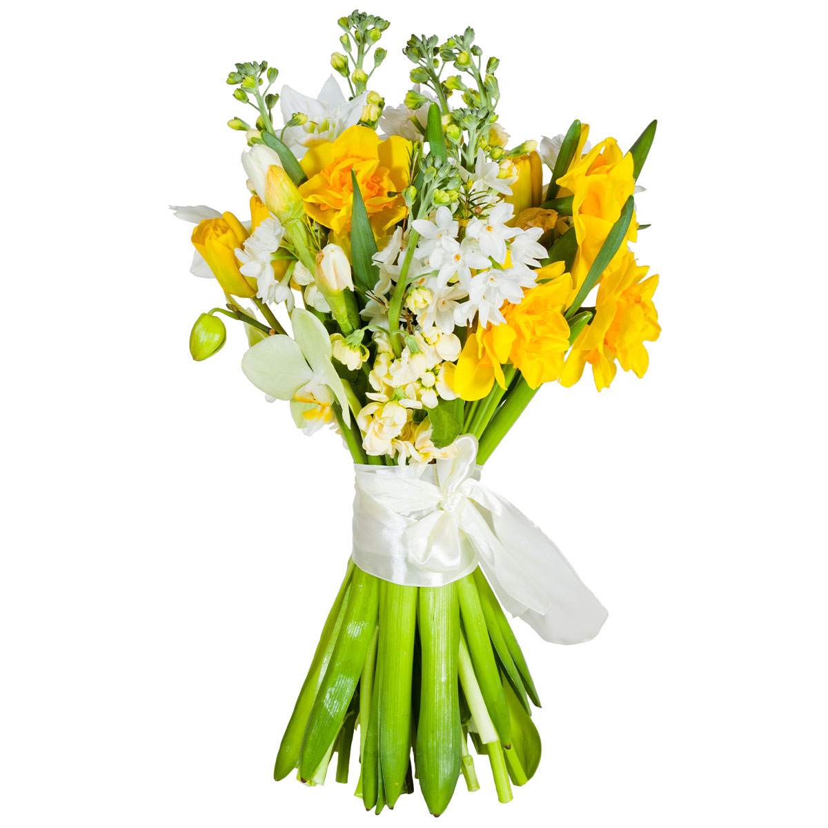 Нарцисс желтый, нарцисс белый, тюльпан желтый, орхидея белая. Упаковка (лента, пленка, крафт, сетка, пленка матовая)