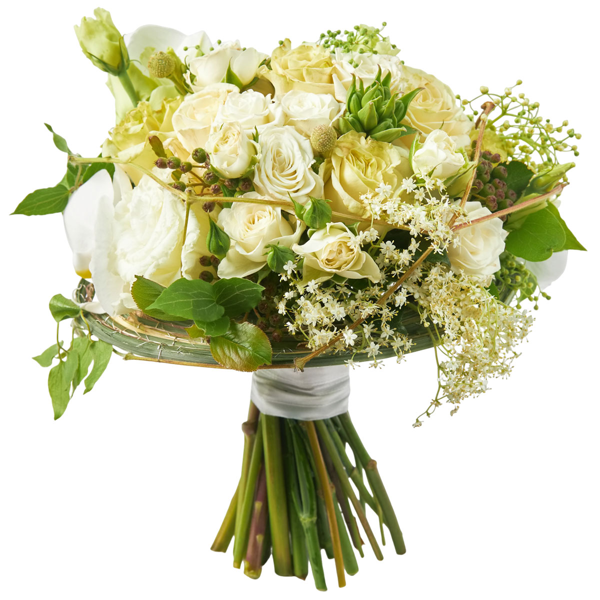 Роза кустовая белая, эустома белая, озотамнус, клематис белый, зелень. Упаковка (лента, пленка, крафт, сетка, пленка матовая)