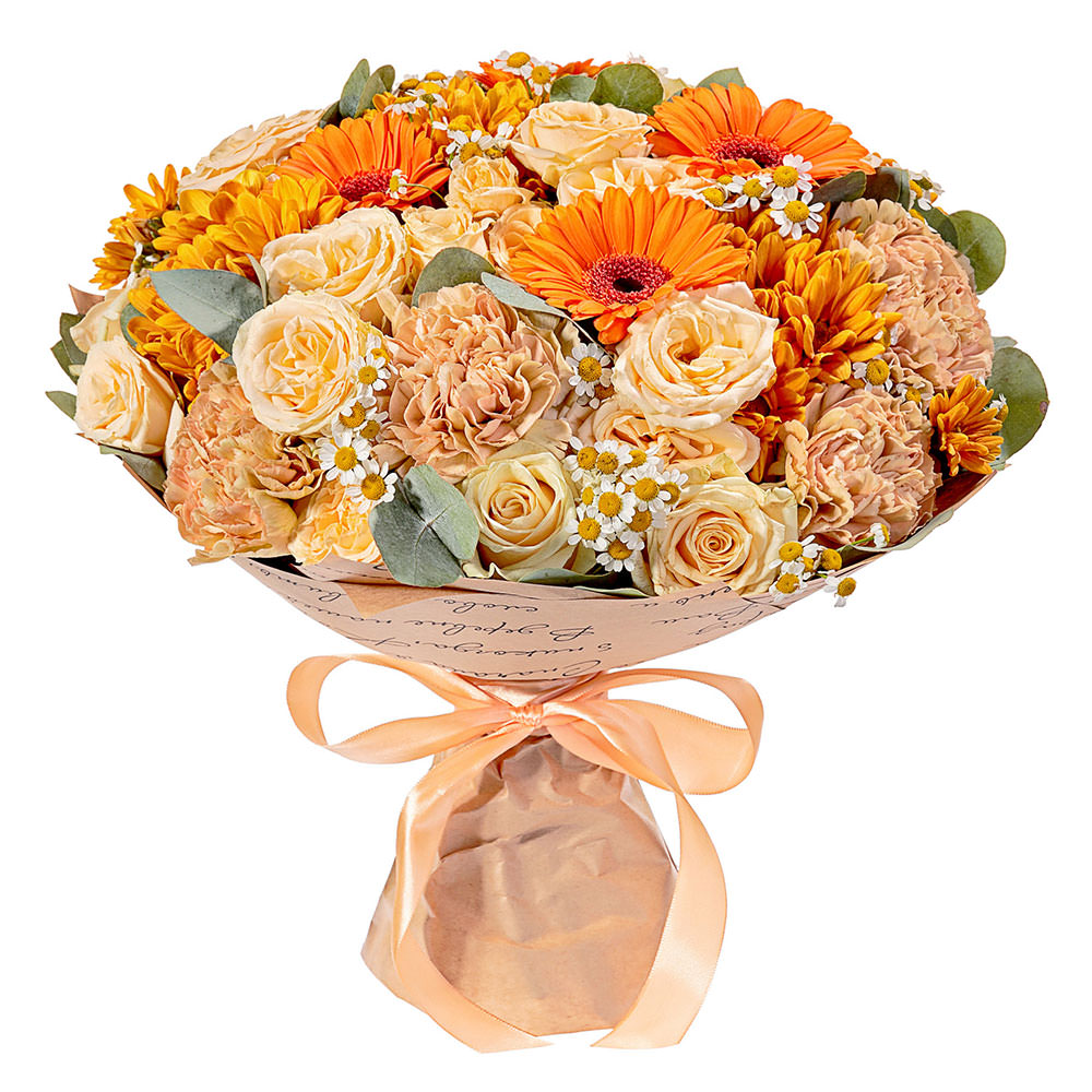 Роза одноголовая кремовая, гербера оранжевая, хризантема кустовая желтая, ромашки, гвоздика кремовая, эвкалипт. Упаковка (лента, пленка, крафт, сетка, пленка матовая)