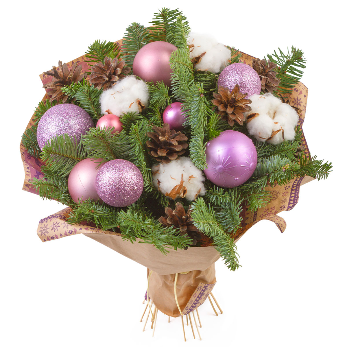 Пихта, хлопок, шишки, новогодние шары. Упаковка (лента, пленка, крафт, сетка, пленка матовая)
