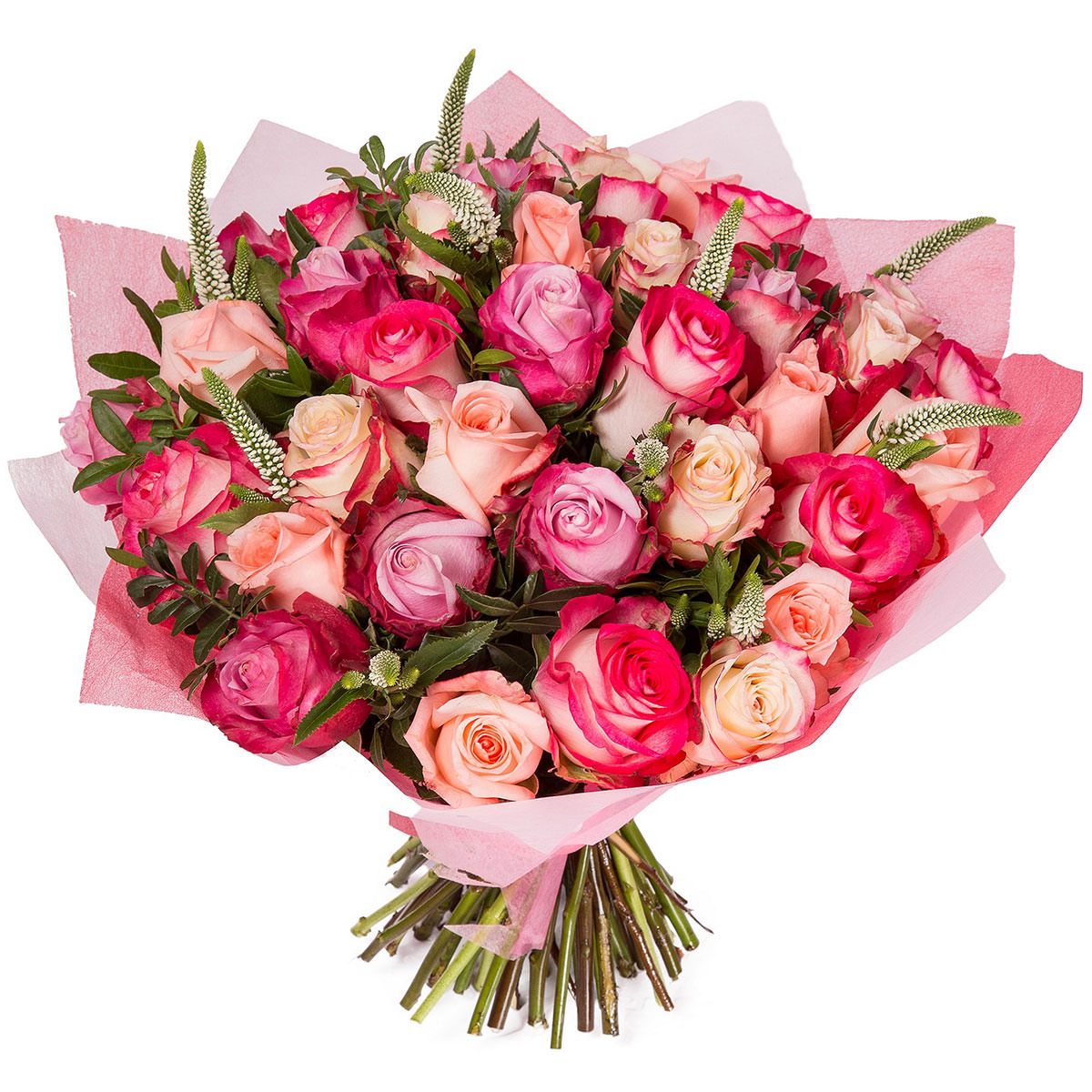 Роза одноголовая розовая и кремовая, вероника белая. Упаковка (лента, пленка, крафт, сетка, пленка матовая)