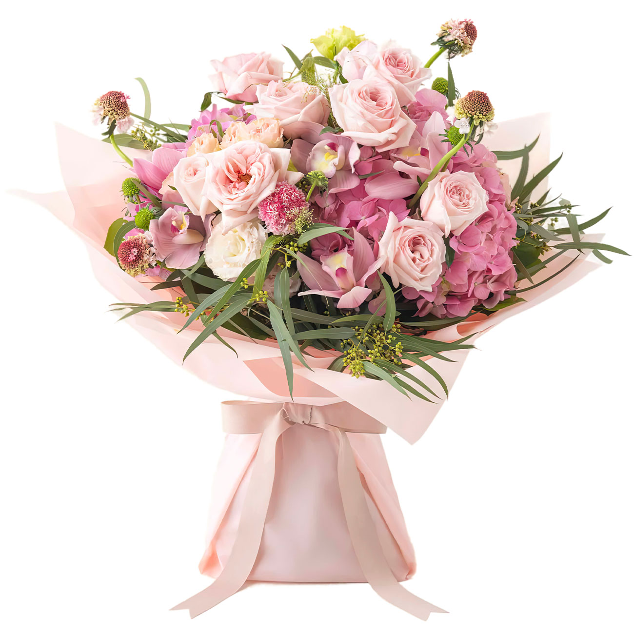 Гортензия темно-розовая, роза кустовая розовая, орхидея розовая, эустома розовая, розовая скабиоза. Упаковка (лента, пленка, крафт, сетка, пленка матовая)