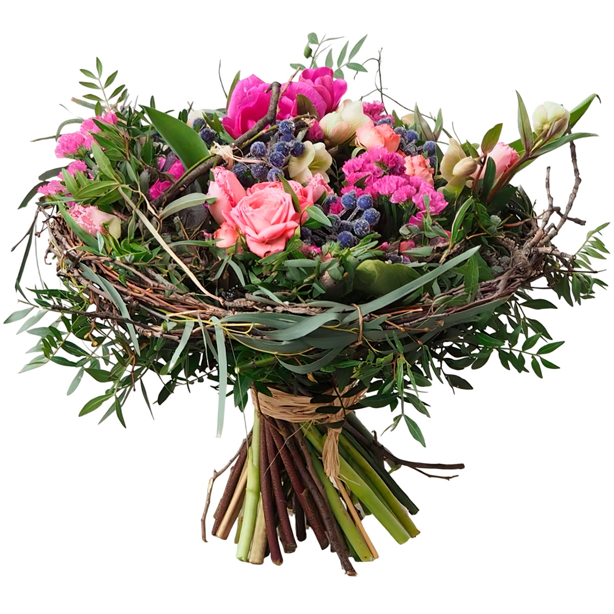 Роза кустовая розовая, фрезия белая и розовая, тюльпан розовый, статица розовая, фисташка, зелень. В каркасе