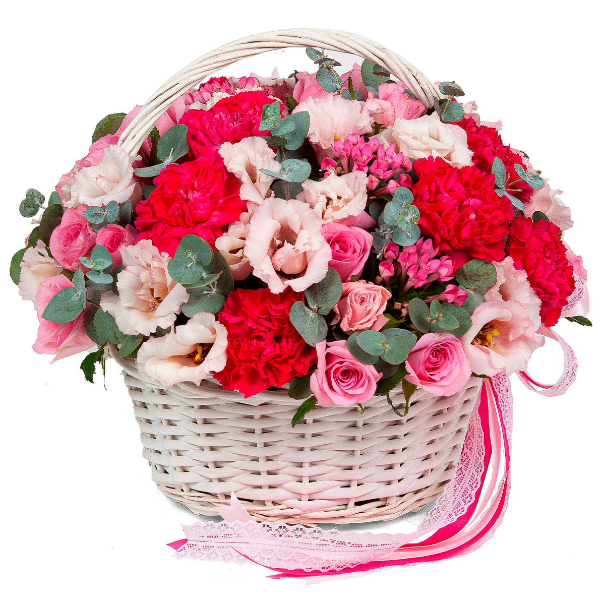 Гвоздика красная, роза кустовая розовая, эустома розовая, бувардия, эвкалипт. Упаковка (Корзина, оазис, ящик).