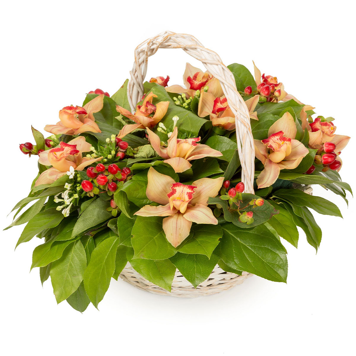 Орхидея персиковая, гиперикум, зелень. Упаковка (Корзина, оазис, ящик).