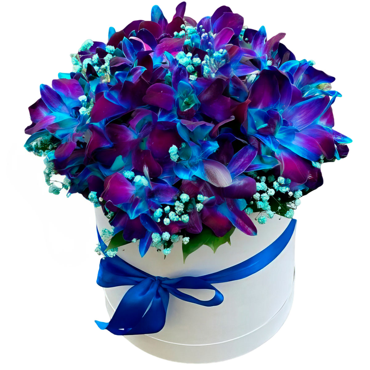 Дендробиумы синие, гипсофила. Упаковка (шляпная коробка, квадратный бокс, коробка сердце, оазис)