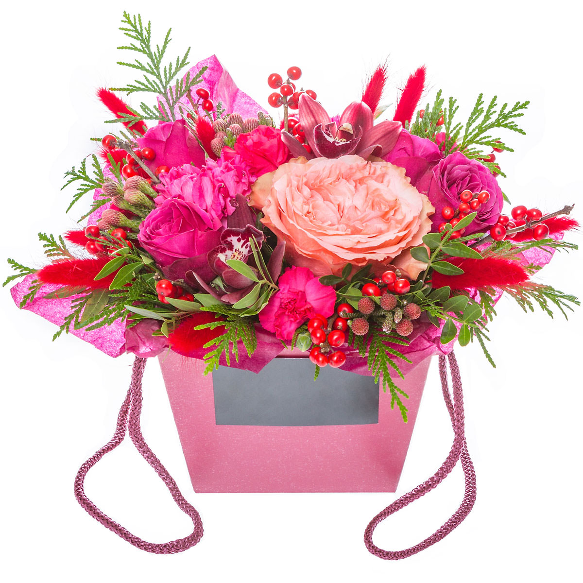 | Состав | Гвоздики, Илекс, Орхидеи, Пионовидные розы, Розы |