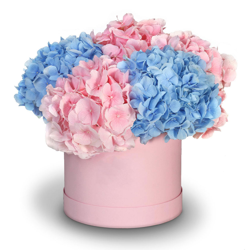Гортензия микс (розовая, голубая). Упаковка (шляпная коробка, квадратный бокс, коробка сердце, оазис)