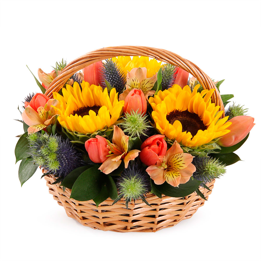 Подсолнух, тюльпан персиковый, альстромерия персиковая, эрингиум. Упаковка (Корзина, оазис)
